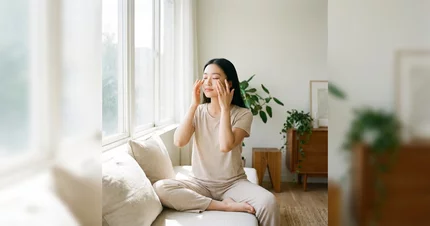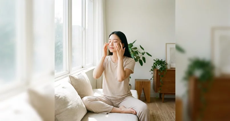 雙手搓熱後,用溫暖的掌心輕輕覆蓋在雙眼上,停留約30秒,感受掌心的溫度,幫助眼部肌肉徹底放鬆,有助入眠。