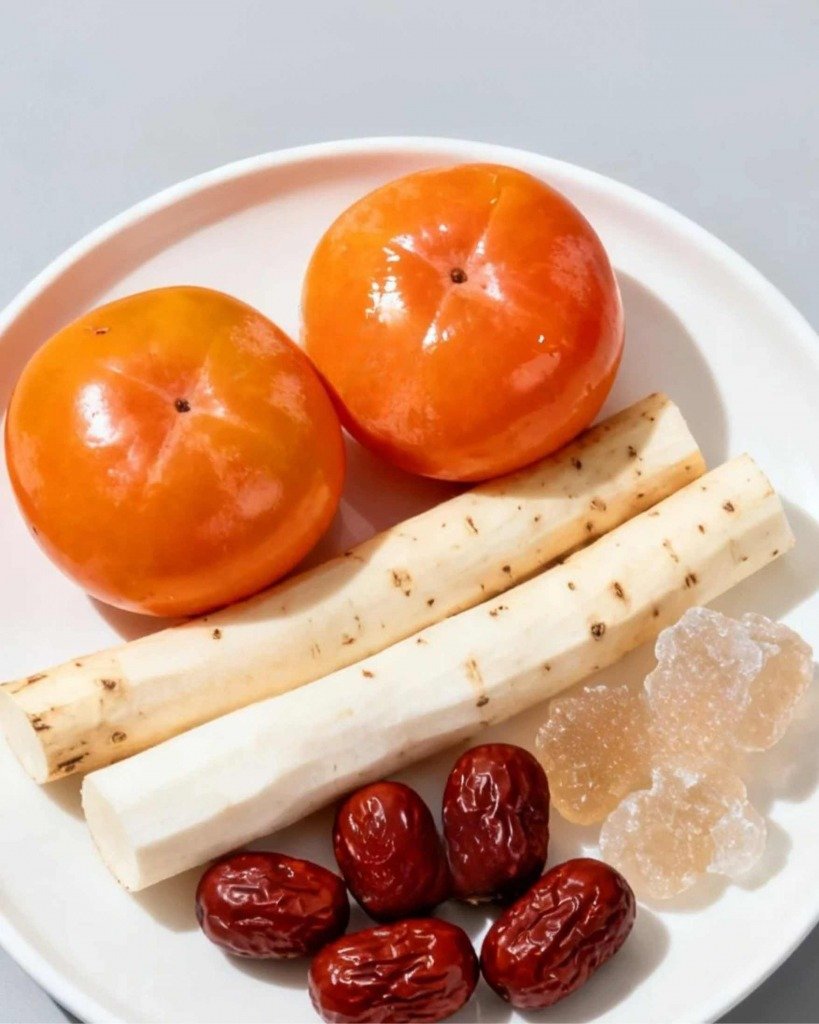 食材:柿子 2個、鐵棍山藥 1根、紅棗 5-6顆、冰糖或鹽適量