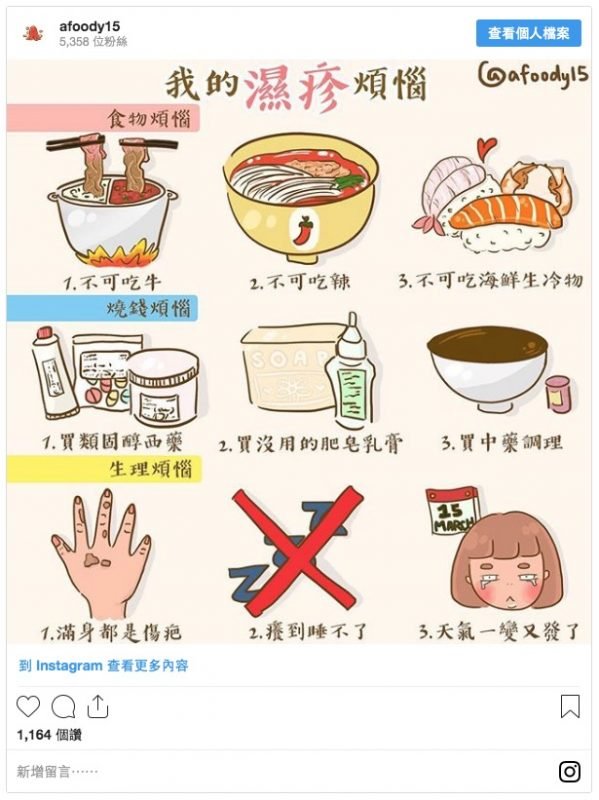 彭醫師指:「肺與大腸屬同一系列,在中醫角度中『肺主皮毛』肺部負責管理人類毛髮和皮膚﹐因此肺燥、大腸差即是體內水液不足,易令皮膚出現乾燥脫皮。」因此若你的濕疹出現以下症狀,即是你的脾胃濕重。