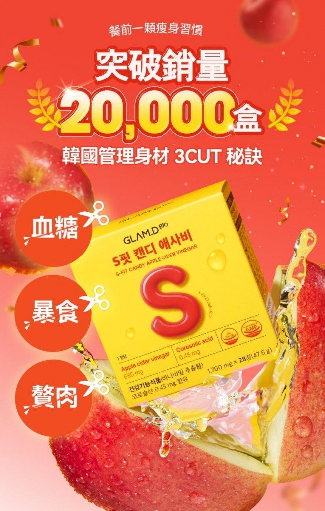 經常抵抗不了美食誘惑,但又怕血糖飆升引發暴飲暴食,導致肥胖、精神不振甚至增加糖尿病風險?GLAM.D的第4代「S-FIT蘋果醋糖」就是你的控糖好幫手。它含有1000mg超高濃度的Premium蘋果醋,再配合有助穩定血糖的香蕉葉萃取物(科羅索酸),達至雙重控糖,效果加倍。
