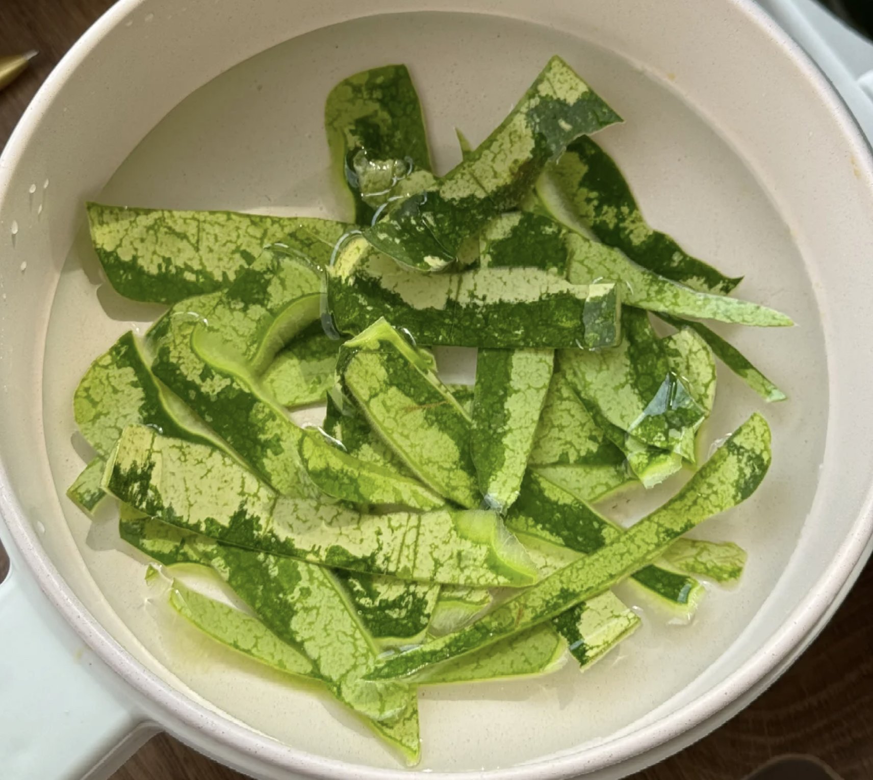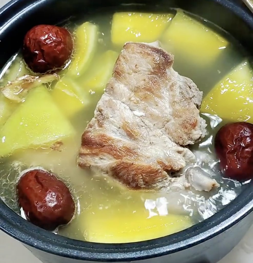 材料:西瓜皮、白色瓜肉(去紅色瓜肉)、蜜棗6顆、西施骨1斤半、果皮2小片、薑2片