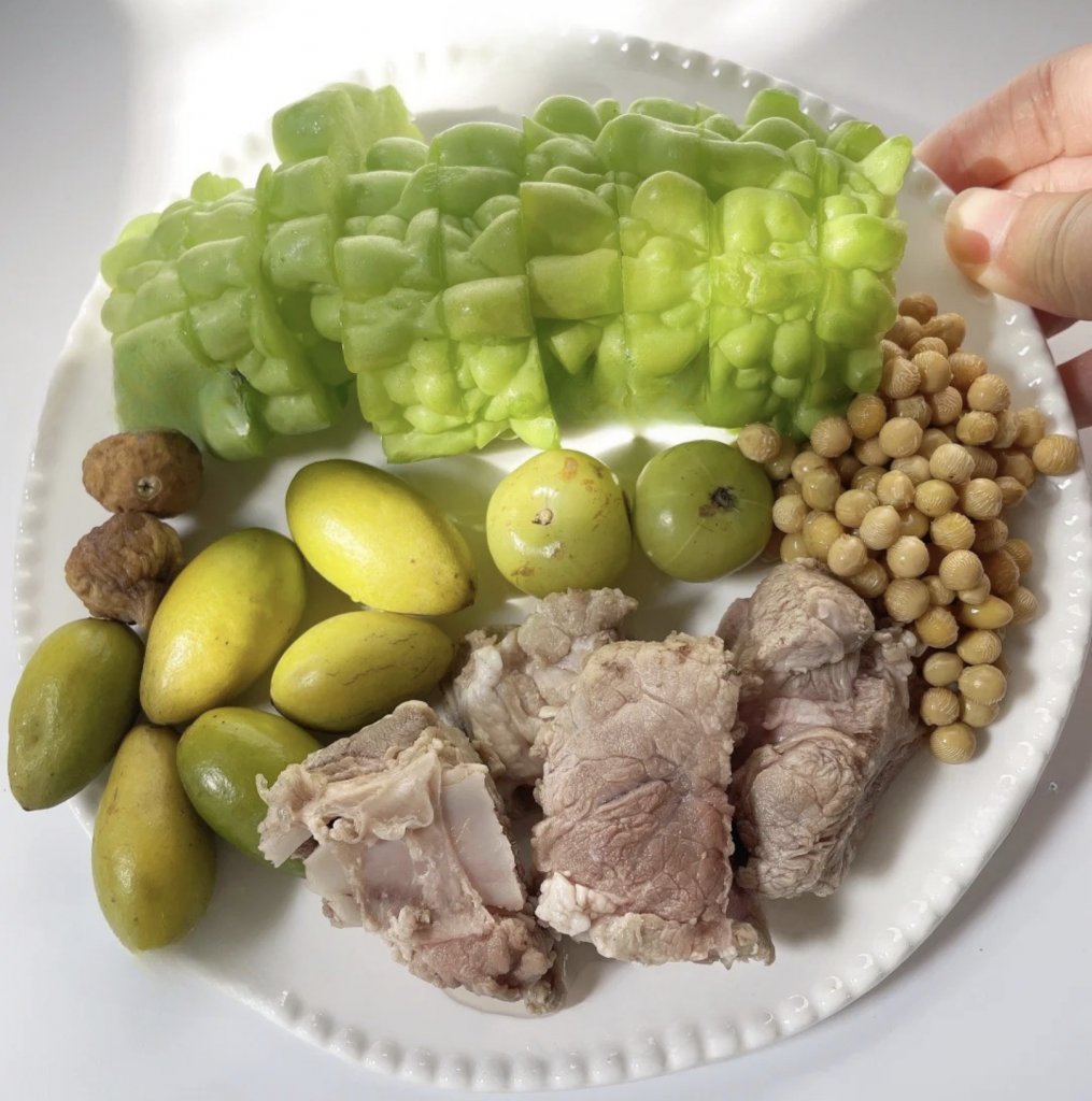 材料:瓜半根、排骨幾塊、黃豆一把、橄欖6顆、油甘2顆、無花果2顆、鹹菜少許