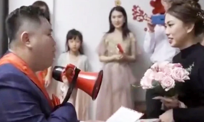 那名新郎被姊妹要求拿著大聲公在新娘面前下跪,惟他指「愛的宣言」太冗長,說不出,只願意答應誓言中的部分內容:「你想聽邊兩句?任你揀兩句。」新娘嬌羞表示:「我想你讀完成段。」然而新郎搖頭表示辦不到:「我沒能力實現。」新娘堅持想聽他讀一次,新郎始終不願意,站起來說:「咁我走喇,拜拜!」當時他臉上還保持笑容。