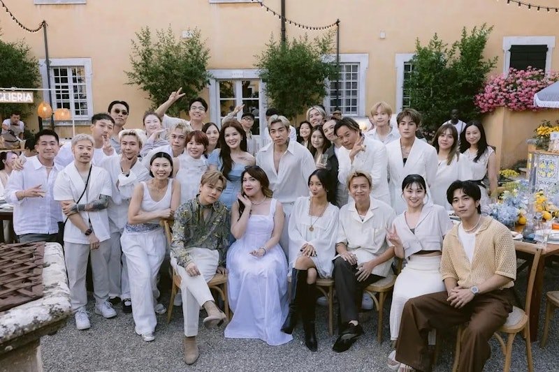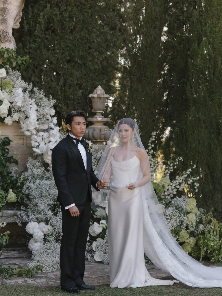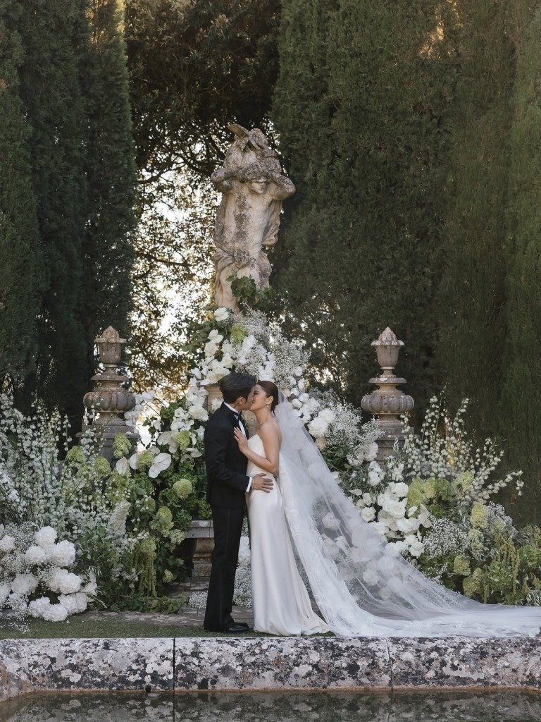 為締造一場難忘的世紀婚禮,Tyson Yoshi與Christy特別邀請專業婚禮策劃團隊協助,選址於被譽為「義大利秘境」的La Foce莊園舉行。這座莊園以濃厚的文藝復興建築風格聞名,綠意盎然的山景與對稱的幾何花園交織成詩意畫卷。從Christy的婚紗照中,白色婚紗與翠綠山林相映成趣,古典石雕與修剪整齊的綠籬花園更為現場增添濃厚藝術氣息。婚禮現場以純白為主調,歐式風格貫穿整體設計。鮮花沿著長桌和場地邊緣綿延鋪設,水晶吊燈閃爍生輝,半圓拱門上點綴著滿天星,營造出浪漫而高雅的氛圍。