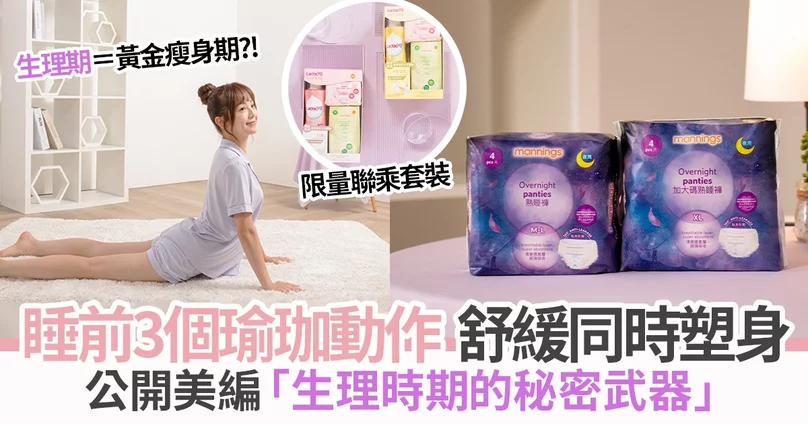 既然生理期是減重的其中一個黃金期,有助消耗脂肪及幫助身體塑形!當然要好好把握,美編會在睡前先穿上360度防漏的萬寧自家品牌熟睡褲,再於床上進行瑜珈拉伸動作放鬆身心,點伸展都唔怕滲漏啦~