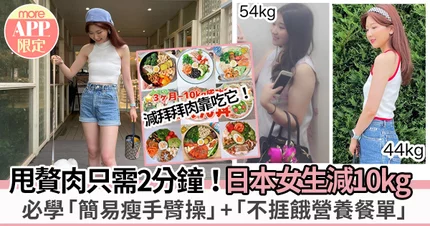 日本女生Hanon的社交平台經常分享自己的瘦身秘訣,吸引了12萬粉絲追蹤,早前她分享了她瘦手臂減拜拜肉的動作,Hanon成功在3個月減去10kg,手臂恢復苗條曲線,穿起緊身衣或背心感到自信。