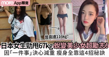 女生們都渴望擁有標準身形,可以駕馭各式各樣的造型靚衫。而20歲的日本少女廣瀨綾香曾擁有116KG,卻非單純因外表而修身,她能下定決心減重全因「一件事」,最後更靠4招秘方成功甩走67KG,蛻變成美少女!能減掉「一個自己」的體重絕對不簡單,即刻參考她的4個修身方法!
