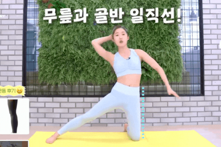 進行側彎延展時,首先採跪姿,讓身體伸直並收緊核心。將左腳向外側伸直,左手輕扶頭部,右手伸往地面,左側便會產生明顯的側彎拉伸感。接著利用核心力量,帶動身體自腰部往左側彎曲,完成一次動作。再換至右側重複,同時保持核心及肩背穩定,以確保動作正確並有效強化側腰線條與提升柔韌度。