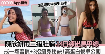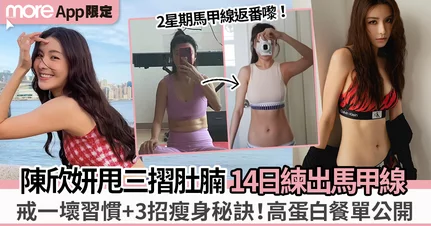 29歲的陳欣妍憑真人旅遊節目《美女郊遊遊》闖出名堂,樣子甜美的她,就連Mirror成員江𤒹生Anson Kong都大讚她「好似一個女神喺我面前」,想不到原來還擁有令人豔羨的超迷人馬甲線!近日陳欣妍與男友沈震軒為Calvin Klein拍攝一輯甜蜜內衣照,兩人盡show超完美體態,線條優美結實,照片性感健康,贏盡讚賞。體態完美的她,原來於上年一度因放肆而吃出三摺肚腩,為了回復纖瘦身形,靠3招用了14天,將肚腩減掉,重現馬甲線。