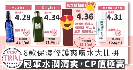 | iTRIAL美編點評 | 平價保濕爽膚水之選,即時用來濕敷也不會心痛,高度保濕之餘持久度很高,還能舒緩乾燥引起的痕癢敏感,屬於修護保濕型爽膚水,不會引起暗粒和粉刺形成,使用後上妝也更加貼服,能增加持妝時間。 |