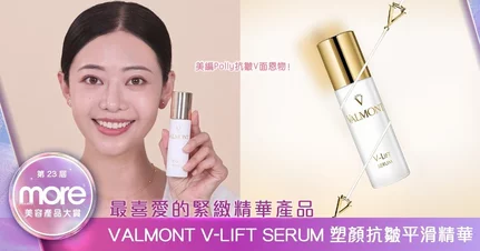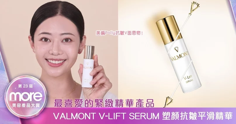 美編Polly最近忙於拍戲,Close up鏡頭很容易曝露表情紋、乾紋、皺紋等,不過Polly自言無懼怕,因為她有肌膚緊緻V面的秘密,正是殿堂級瑞士抗衰老品牌、有「時光魔法師」之稱的VALMONT皇牌V-LIFT Serum 塑顏抗皺平滑精華!全因它以導向輸送科技,如無人機般精準輸送護膚成分到有抗老需要的細胞,從根源解決皺紋問題,輕鬆獲得緊緻細滑的肌膚。這款產品憑藉其卓越的抗衰老效果,在MORE美容產品大賞競爭激烈下,深得讀者支持,榮獲今年「最喜愛的緊緻精華產品」!