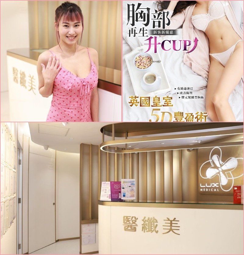賣點: 「LUX Medical 醫纖美」提供多種美胸護理療程,例如「英國皇室5D豐盈術」和「纖盈全面穴位荷爾蒙豐胸術」、「頂級電解疏通淋巴磁療儀」、「殿堂級皇室增脂豐胸術」,這些療程結合了先進儀器技術和獨家按摩手法,旨在疏通乳腺、刺激膠原蛋白再生,並改善胸部鬆弛下垂等問題。 「LUX Medical 醫纖美」美胸護理療程採用英國殿堂級皇室專利科技,結合獨家按摩手法,達到更好的護理效果。 「LUX Medical 醫纖美」會根據個人情況,運用「紅光乳腺檢測」紅光科技及早透視胸部問題,特殊光學技術發出600-700nm深入皮膚20mm深處,能幅照胸部投光度,靜脈暗線及血管分佈情況,迅速準確地透視出乳房問題,提供專屬的個人化療程方案,例如療程次數、護理方法等。絕對零副作用,安全可靠。