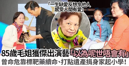 10幾年前,魚毛姐已將電視台頒贈的一筆約20幾萬長期服務金,捐了3分1去內地貴州,興建一間小學,名叫「余慕蓮希望小學」,只望山區小朋友不用每日都長途跋涉上課讀書!加上自己沒有結婚又沒有下一代,更加希望能幫助有需要的小朋友,令他們有更好將來!