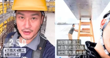 昨日香港掛起3號風球,橫風橫雨但依然無阻吳浩康前往地盤工作。Deep在社交平台上發布了一段視頻,展示自己在中環搭建S2O潑水音樂節的舞臺。Deep和他的同事們也DIY了一個避雨區,用大木板和木梯搭建,足見他們的機智和團隊合作,又發文自嘲:「#好鍾意返工 #自製避雨空間 #中環海濱 #搭架」。