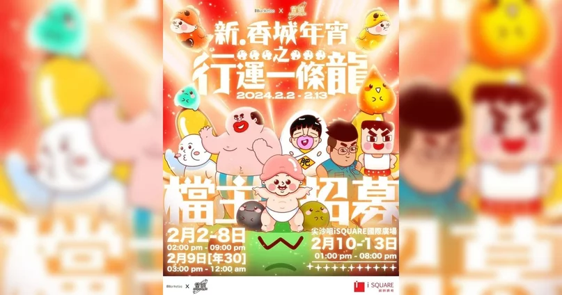 Marketoo今年將在iSQUARE舉辦「新 · 香城年宵之行運一條龍」的年宵市集,為大家呈獻一場令人驚艷的盛會!這個市集集結了眾多知名Youtuber和本地插畫家的力量,包括Cheeky Cheeky、厚面子、大麻成@taimasing1999、東尼電機、肥姨姨、DDED、Oh…little sweet等等。他們將共同參與這場盛會,為大家帶來無盡的歡笑和驚喜。同時,還有眾多本地/手作品牌精心參與,為市集注入了獨特的風格和創意。在這個龍年,讓我們一同享受這場行運的盛會,感受到年宵市集帶來的喜悅和祝福!不容錯過的精彩活動等著你來參與!