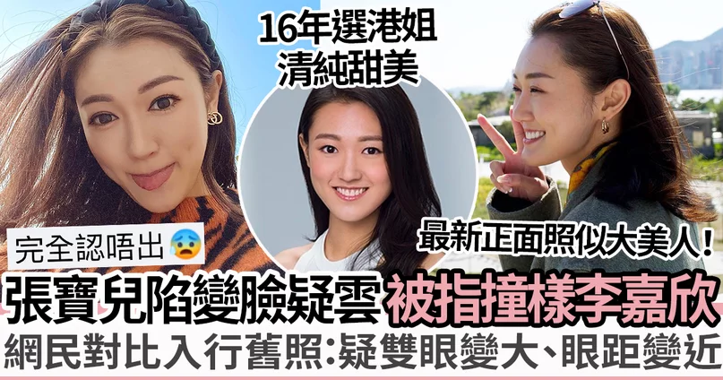 近年來常有網友指張寶兒五官變得更精緻,有網民就指她跟李嘉欣撞樣,相當誇張。因此有網民翻出6年前張寶兒參選香港小姐時的相片,對比之下五官除了變得更精緻立體外,眼形亦稍稍變長,難怪引起網民猜測。