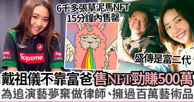 近年興起NFT、元宇宙這些名詞,由加密貨幣衍生出的加密藝術熱潮是近年潮流界最新玩意,任何人都可以透過加密鍵技術,將自家制藝術品上傳並保存,放在網上拍賣,吸引了不少圈中藝人參與。而近日因為參演《青春不要臉》而人氣急升的戴祖儀原來亦是圈中首批低調玩NFT的藝人。日前更有報導指,她有份投資為數6888隻的「草泥馬NFT」,在15分鐘內火速售罄,一鋪勁賺500萬元。