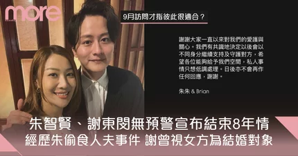 朱智賢與謝東閔的愛情長跑8年,然而,就在昨晚(17日),這對情侶在社交平台上發布了共同聲明,宣布他們已經分手。「謝謝大家一直以來對我們的愛護與關心。我們有共識地決定以後會以不同身分繼續支持及守護對方,希望各位能夠給予我們空間,私人事情只想低調處理。日後亦不會再作任何回應,謝謝。」這段話標誌著他們長達8年的關係畫上句點。