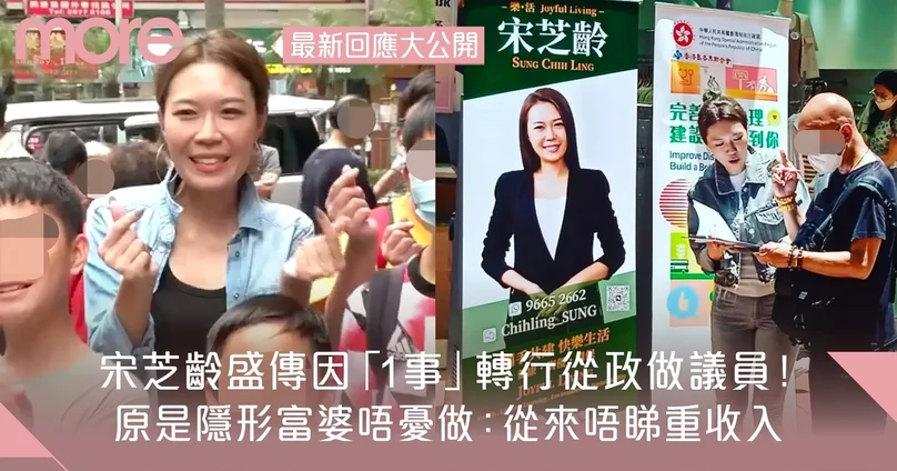 而做主持以外,宋芝齡不只從商,近年仲積極轉型,除了擔任「自由黨灣仔支部主席」,又是慈善機構「藍聲行動」的第一副主席,仲做埋政府地區幹事,不時落區參與慈善活動,因此被指是為參選做議員鋪路,對此宋芝齡就表示自己唔係從政,只係想做地區工作,去幫助基層市民,又話要睇市民反應,怕市民未能接受,所以暫時唔會參選做議員住。