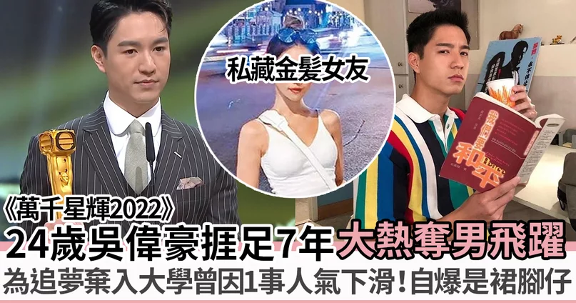 於今晚(8日)舉行《萬千星輝頒獎典禮2022》中「飛躍進步男藝員」一獎由入行7年的年輕演員24歲的吳偉豪奪得,當年憑著《愛.回家之開心速遞》「朱凌凌」一角而漸漸入屋,近年更先後加入《有種好男人》、《回歸》劇組拍攝正劇,最終憑著靚仔有型的外表加亮眼表現而奪獎。