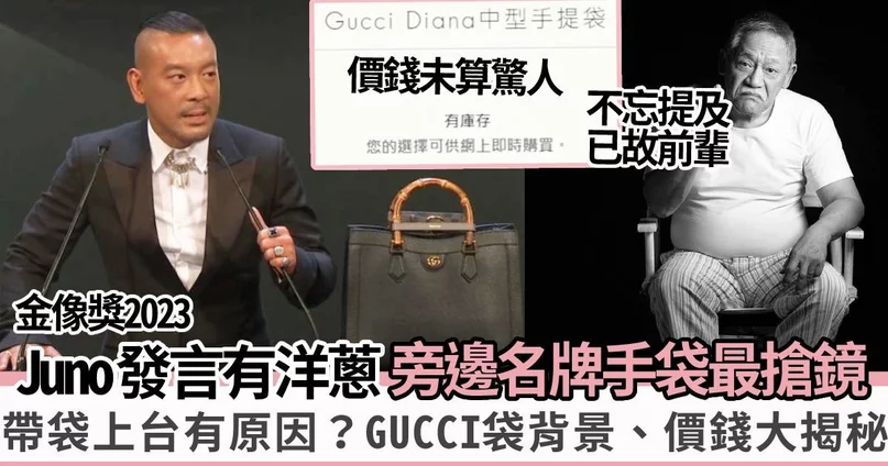 不過,除了Juno的洋蔥發言外,一向是潮流指標的他,在剛上台時已把一個黑色Gucci手袋放在左邊的頒獎台上,完整logo及全個手袋都陪伴著他全程直播出街,絕對比Juno本人更搶鏡!