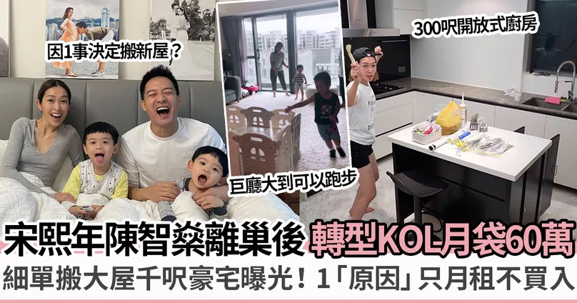 陳智燊和宋熙年婚前在將軍澳租住的是只有幾百呎的小單位,婚後Jason同Sarah看中了馬鞍山,曾用近三萬月租租住天宇海一個過千呎單位,一直住到今次搬新屋。由於夫妻兩人其後轉職做 KOL,經常在家中就地取材拍片帶貨,再加上親子互動令每個家中角落都是父子倆的遊戲間,不經意將大屋布置間隔都曝埋光,目測屋中布置簡單又溫馨、大廳闊落走廊又長又深、至少三房間隔,兩公婆、Damon、工人姐姐各有一間房,比起以前寬敞不少!