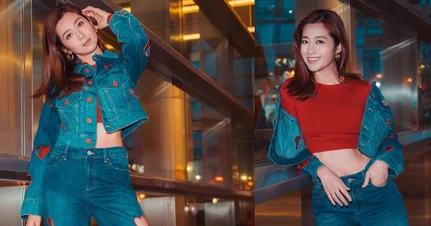 照片中,陳自瑤身穿牛仔褸,入面加件紅色短衫,更故意不扣鈕輕輕騷出小蠻腰,完美展現馬甲線!好友連詩雅同黃翠如留言大讚,更有網民笑指如果叫老公王浩信睇呢輯相,一定可以燃起愛火!