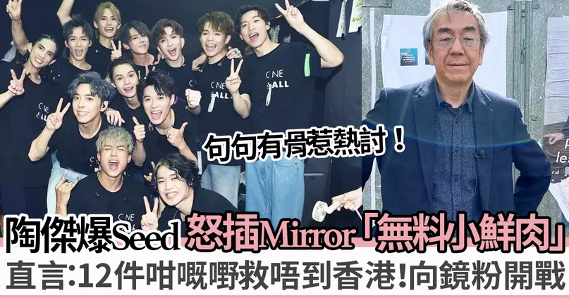 陶傑爆Seed話Mirror :「依家華語片同成個亞洲嘅電影工業,基本上都有種年齡歧視,依家香港都係,睇嚟睇去都MIRROR,MIRROR唔係話唔好,你可以喺情感方面向佢投射,但12件咁嘅嘢呢,樣樣小鮮肉,搓埋一團麵粉,拉番出嚟,我唔覺得分得開邊個打邊個囉!係你有啲人話分得開啫,我唔覺得係囉,所以呢,呢啲係虛火嚟嘅,對唔住呀,你可以有一種『傘後』,即係19年之後,自己嗰種一廂情願嘅政治情感投射,但係MIRROR係救唔到香港嘅任何工業同影視嘅,真係對唔住,因為呢一行係要真材實料,係要深度同內涵嘅。」