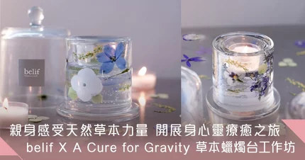 belif聯乘香港手工香氛蠟燭品牌A Cure for Gravity,舉辦草本蠟燭台工作坊!以擁有超過150年歷史的Duncan Napier傳統護膚配方為主題,結合多款belif產品的天然草本植物元素,讓客人親手制作獨一無二的草本蠟燭台。配上天然香薰蠟燭,讓您恍如置身於大自然,以怡人芳香療癒身心靈。