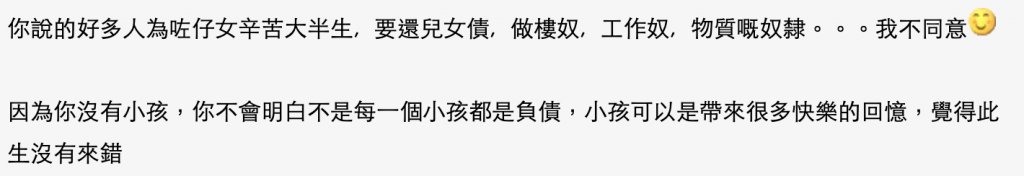 雖然沒有下一代,但事主指自己一個人用錢更輕鬆,認為閒時可以請爸媽吃自助餐,作為家中長子的他也可以請一家去旅行,認為這點才是真正孝順的表現。