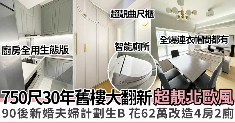 舊樓裝修 | 62萬全爆翻新愛巢 改4房2廁 超靚北歐風 曲櫃實用美觀