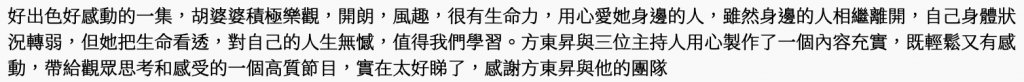 而當年一同受訪的還有胡婆婆的幾位好友,不過她表示有幾位已經先後過身,不過胡婆婆並沒有傷心,反而認為「人生便是這樣」,坦言生老病死是自然定律,人生一遭也是不枉此生。