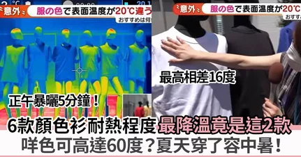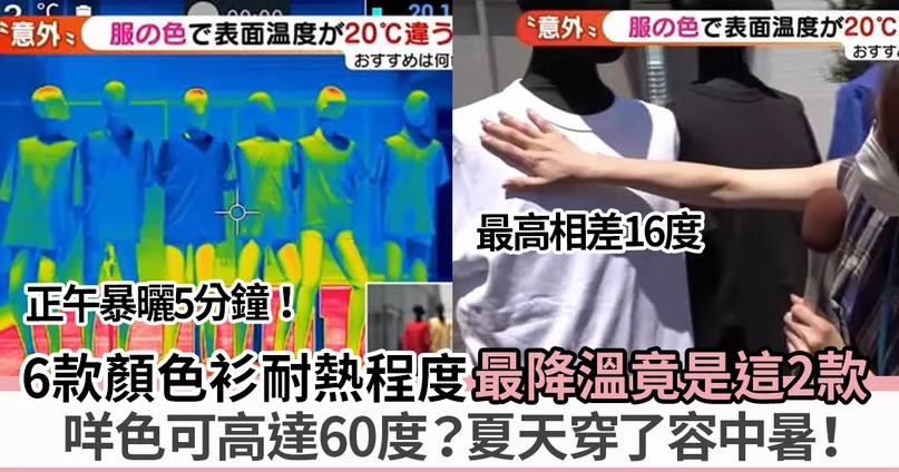 日本早前氣溫也急升,岐阜縣曾錄得最高37.9℃,香港雖然未有如此高溫,但潮濕悶熱的天氣令體感溫度上升非常難受。名古屋電視台的節目《メ〜テレニュース》早前就測試了紅、黃、白、黑、藍和綠,6件材質一樣但顏色不同的T-shirt,在正午12點半於太陽下曝曬5分鐘後,各種顏色的表面溫度會有何變化。