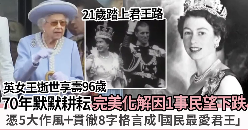 英女王出生於1926年4月21日,在其父親喬治六世逝世後翌年,1953年正式加冕成為英國女王。在位70年間曾遇上多件風浪,包括英國地位改善、殖民地獨立問題,更曾因為兒媳戴安娜王妃事件,被民眾指責冷處理導致民望急速下跌,但她都一一化解,並成為英國人民心中喜愛的君王。