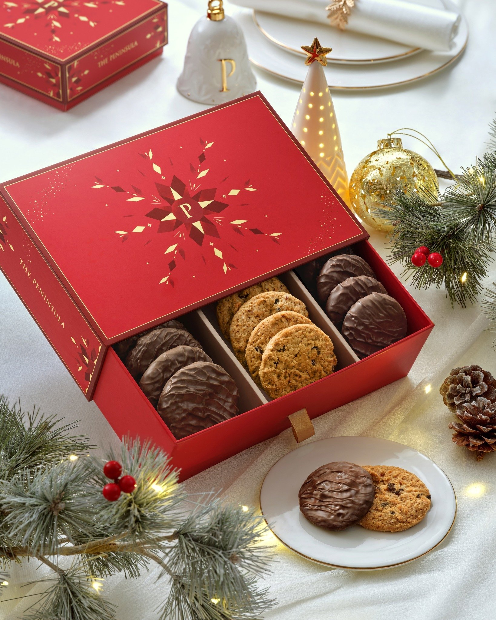 在閃耀燈飾和星空的陪襯下,半島精品店以節日魔法悄然展現冬日氛圍,推出精選手工朱古力、香脆餅乾、豐盛禮籃及頂級佳釀,為迎接佳節增添溫馨愉悅。凡於店內購買最少一款節日系列產品,並滿800港元,即可獲贈雪花掛飾一個,消費滿1,500港元更可獲贈節日掛飾一個。