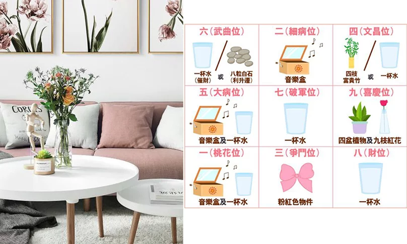 東北桃花位放一杯水、正北爭鬥位放粉紅色物件,化事非同時旺人緣。