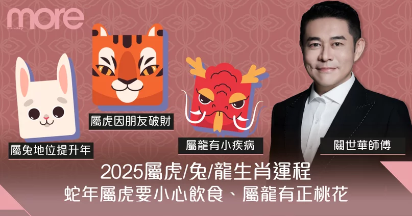 2025蛇年十二生肖運勢出爐!想知道來年感情、事業、健康運順利與否,有否貴人相助,即睇關世華師傅關於屬虎、兔、龍生肖運程預測及開運貼士,幫你時來運轉!希望大家蛇年身體健康、明艷照人同萬事如意!