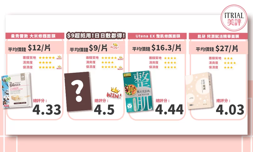 每到秋冬,很多人都愛問有沒有保濕面膜推薦,所以今次就來跟大家分享數款獲iTRIAL會員大讚好用的平價面膜,最平只需$9一片,最貴一款也不過$110/4片(約$27/片),絕對是抵用推介,天天敷「荷包」也不會心痛!哪款敷起來最保濕?哪款敷起來最貼服?想知道美編和iTRIAL會員最推薦哪一款片裝保濕面膜?一起看下去吧!