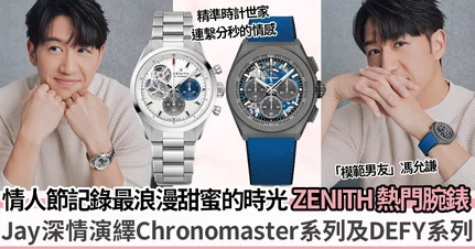 情人節與愛人牽手共渡,當下都想幸福時光直到永遠,LVMH集團旗下瑞士高級製錶品牌ZENITH,藉着情人節邀請品牌好友、「模範男友」馮允謙(Jay)為個性活潑、時尚情侶挑選ZENITH熱門腕錶,寄意真愛延續每分每秒,記錄最浪漫時光,今次Jay 以一身優雅活力的造型佩戴ZENITH Chronomaster系列及DEFY系列腕錶,展現暖男魅力。