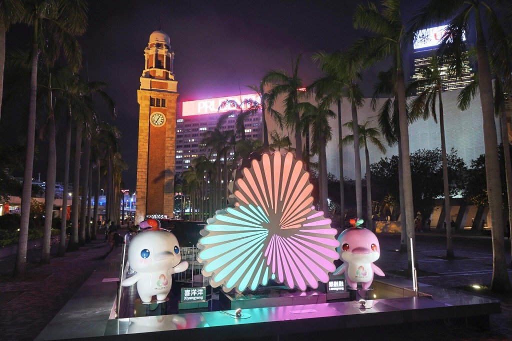 今年香港文化中心露天廣場的中秋綵燈展以《全運綻放》為題,以第十五屆全國運動會(十五運會)及全國第十二屆殘疾人運動會暨第九屆特殊奧林匹克運動會(殘特奧會)會徽和吉祥物「喜洋洋」「樂融融」為核心,打造炫目打卡地標。利用層疊雕刻工藝及光影動態技術,十三個運動項目圖標在不同形狀的鏡面燈箱中閃耀跳動,生動展現運動的韻律與美感。水面上的火炬化作漂浮金屬花瓣,配合流動光影,猶如煙花綻放,象徵活力與歡慶,也表達世界融合。此裝置由本地多媒體藝術工作室納設計及建築事務所設計,透過光影交織展現出「團結、拼搏、歡慶」精神,完美詮釋十五運會與殘特奧會精髓,是一場結合藝術與運動的視覺盛宴。