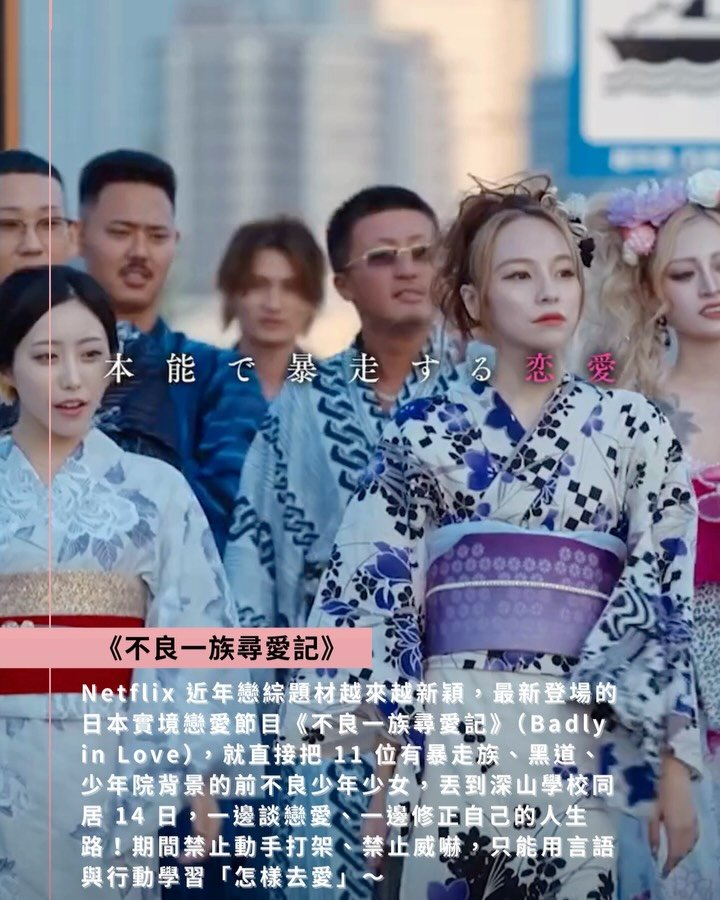Netflix 近年戀綜題材越來越新穎,最新登場的日本實境戀愛節目《不良一族尋愛記》(Badly in Love),就直接把 11 位有暴走族、黑道、少年院背景的前不良少年少女,丟到深山學校同居 14 日,一邊談戀愛、一邊修正自己的人生路!期間禁止動手打架、禁止威嚇,只能用言語與行動學習「怎樣去愛」~
