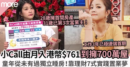 小Call從小就生活在沒有私人空間的房子:「我真的很想要擁有自己的房子,我不知道擁有自己的房子是甚麼感覺」本著當業主的夢想,小call成功靠獨門省錢方式終於在2012年花了70萬買下了17坪的房子。後來於31歲時,再以195萬低價買下地段尚好同樣是17坪的舊宅。2014年更以330萬的好價錢售出再當作首期買下46坪的新屋。其實小資女們只要有效地理財,憑著自己的力量也可以以「細屋換大屋」。