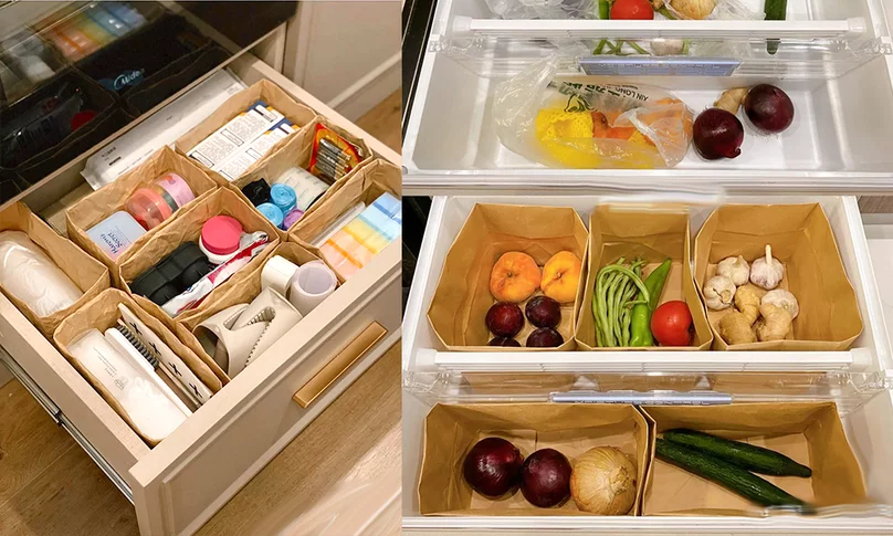 可用來將廚房的調味料、食材整理好,亦可把儲物盒放在雪櫃裡,用來放蔬果,更有一個好處,就是紙袋可以吸濕,避免蔬菜總是濕漉漉的,用完後更可把紙袋曬乾重用。