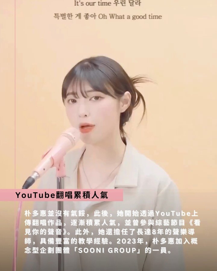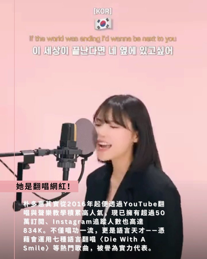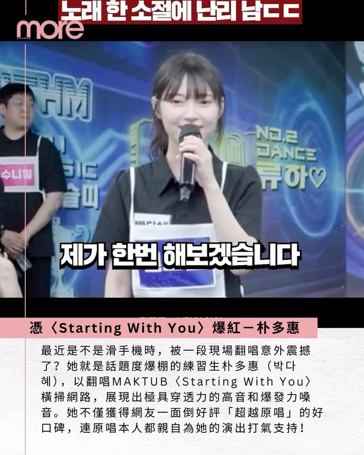 你滑IG時是不是也曾滑到這位超強爆發力嗓音的女生?她就是話題度爆棚的練習生朴多惠(박다혜),以翻唱MAKTUB〈Starting With You〉橫掃網路,展現出極具穿透力的高音和爆發力嗓音。她不僅獲得網友一面倒好評「超越原唱」的好口碑,連原唱本人都親自為她的演出打氣支持!一起來了解這位實力派女生朴多惠~