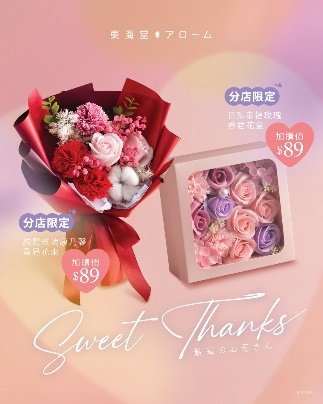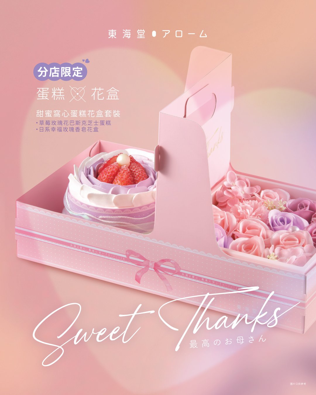 母親節為偉大媽媽準備驚喜!東海堂アローム由即日起推出「Sweet Thanks最高のお母さん」系列,3大推介包括:「芒果夢幻蝴蝶」雲呢嗱慕絲+芒果軟心,清新象徵永美;「雙重開心果禮物」多層開心果奶凍,甜蜜打開驚喜;「溫馨熊仔心型草莓朱古力」可愛守護愛。加購玫瑰康乃馨香皂花束僅$89!即日起至5月7日早鳥優惠86折,網限瑰麗