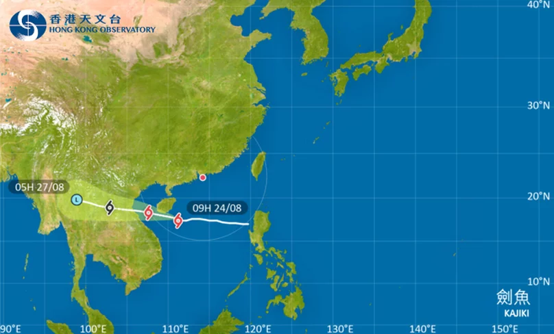 颱風劍魚位於北緯 174 度,東經 1112 度 (即香港之西南偏南約 630 公里)。中心附近最高持續風速每小時 130 公里。劍魚會在今日移向海南島以南海域。