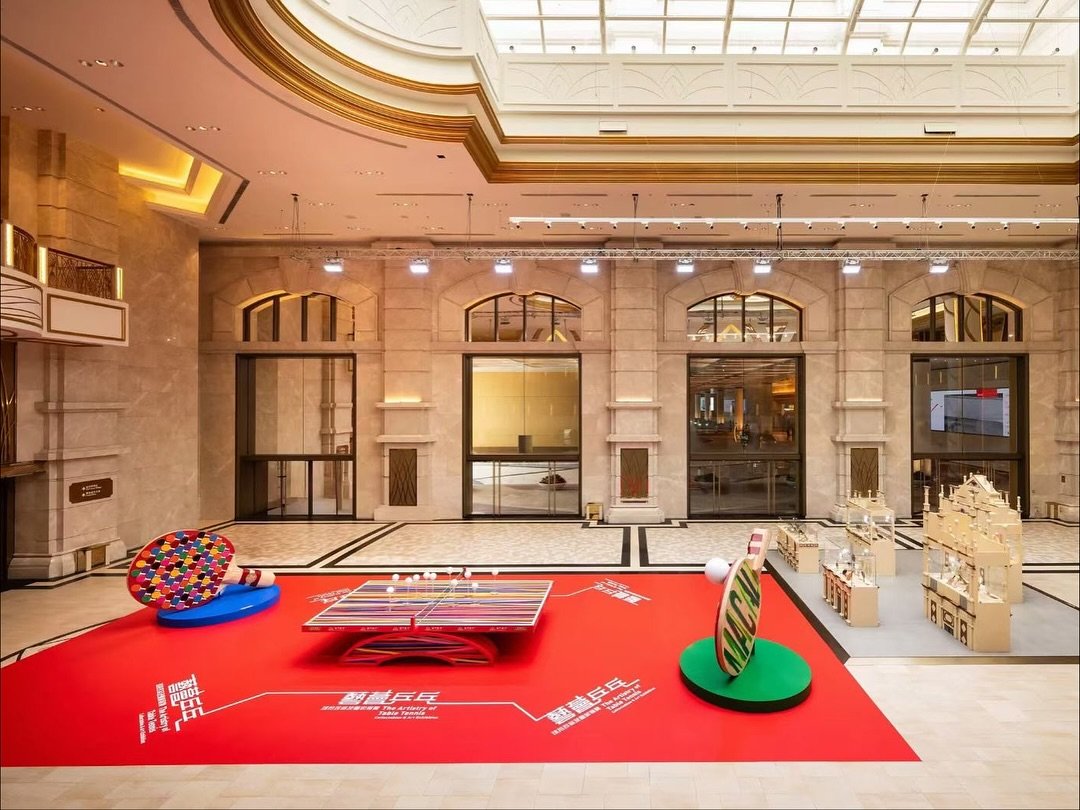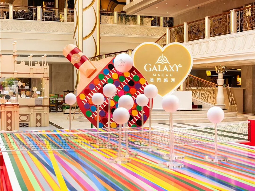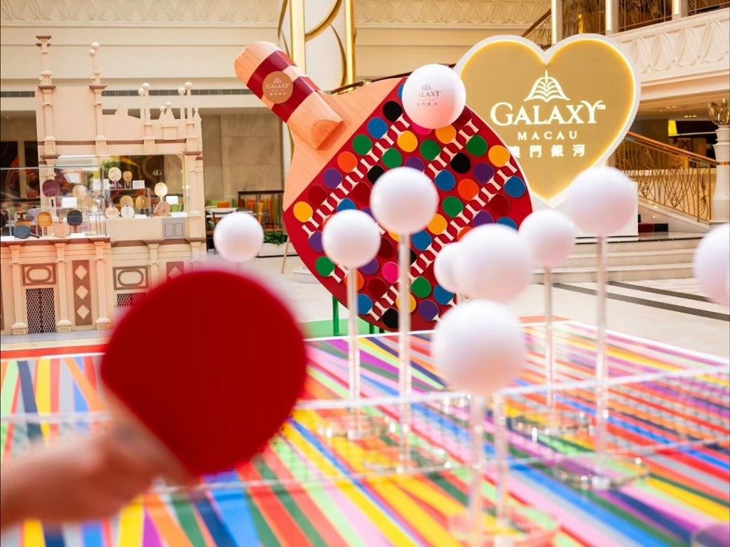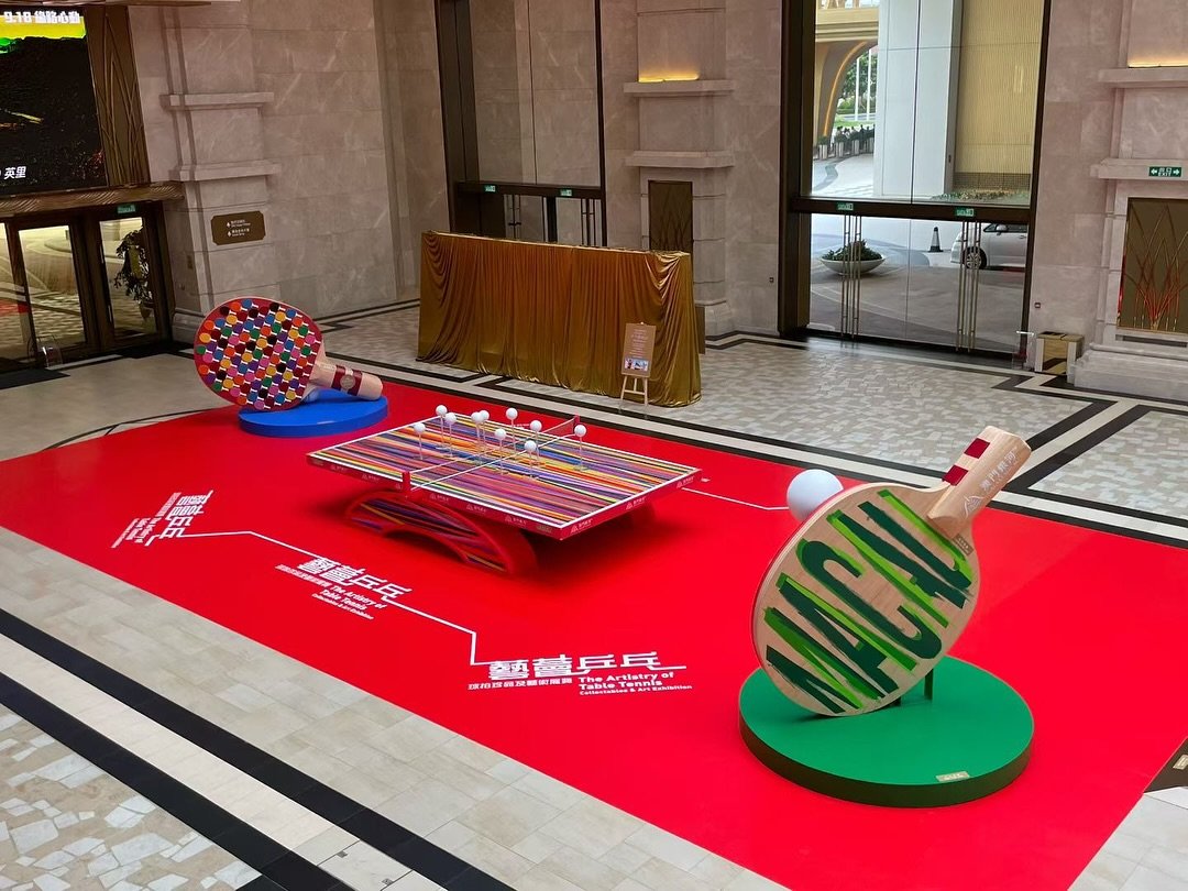 除了《Bruno Moinard意象境界》特展,同場還可看「藝薈乒乓」展覽。展覽通過巨型彩色膠帶球桌與球拍藝術裝置,展現速度與能量,並以手繪「Galaxy」與「Macau」字樣傳遞澳門風情。珍品典藏區靈感來自大三巴牌坊,以五個展櫃詳述乒乓球的歷史與設計演變,結合簽名球拍與現代創新,充分展現體育與藝術的深度融合。