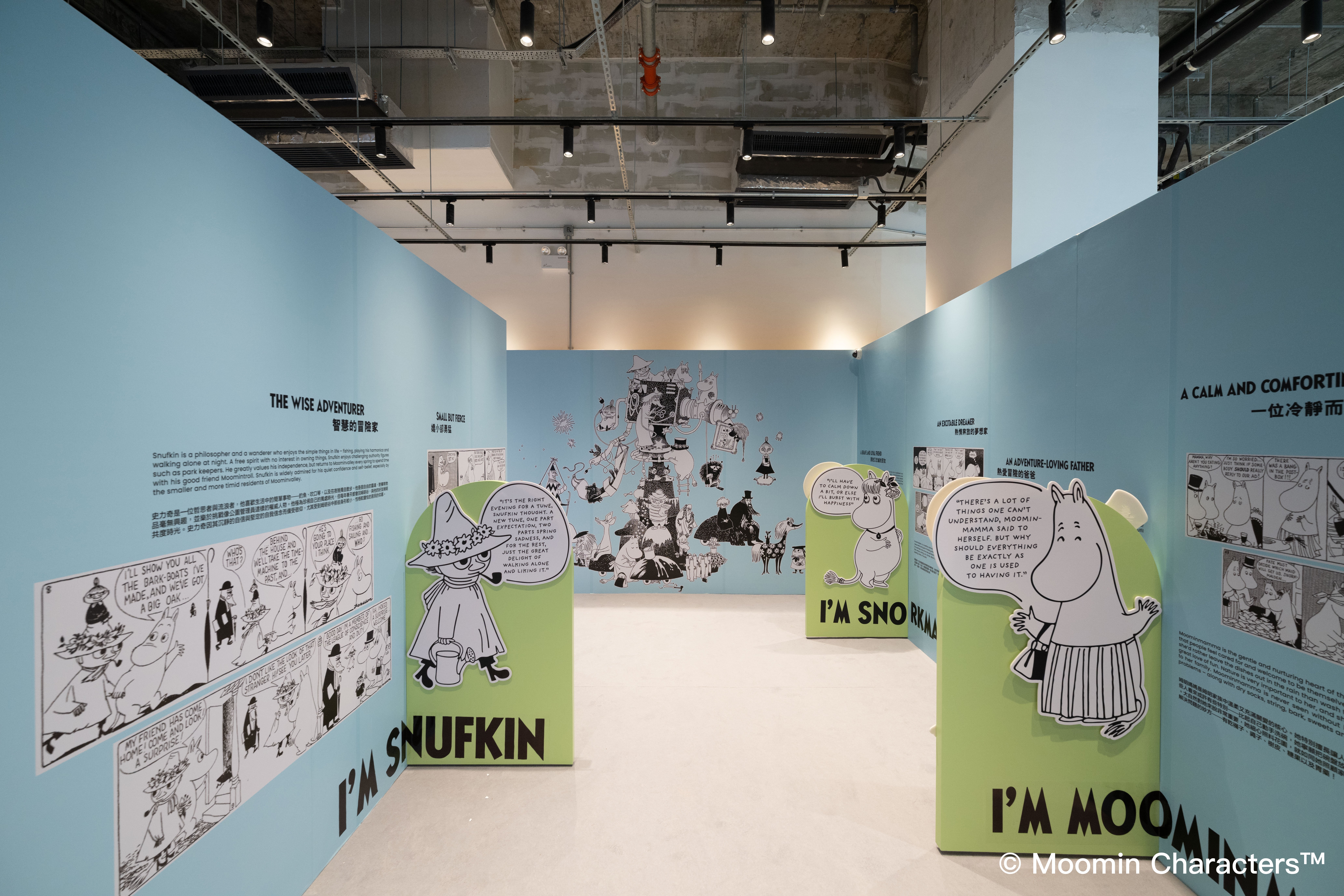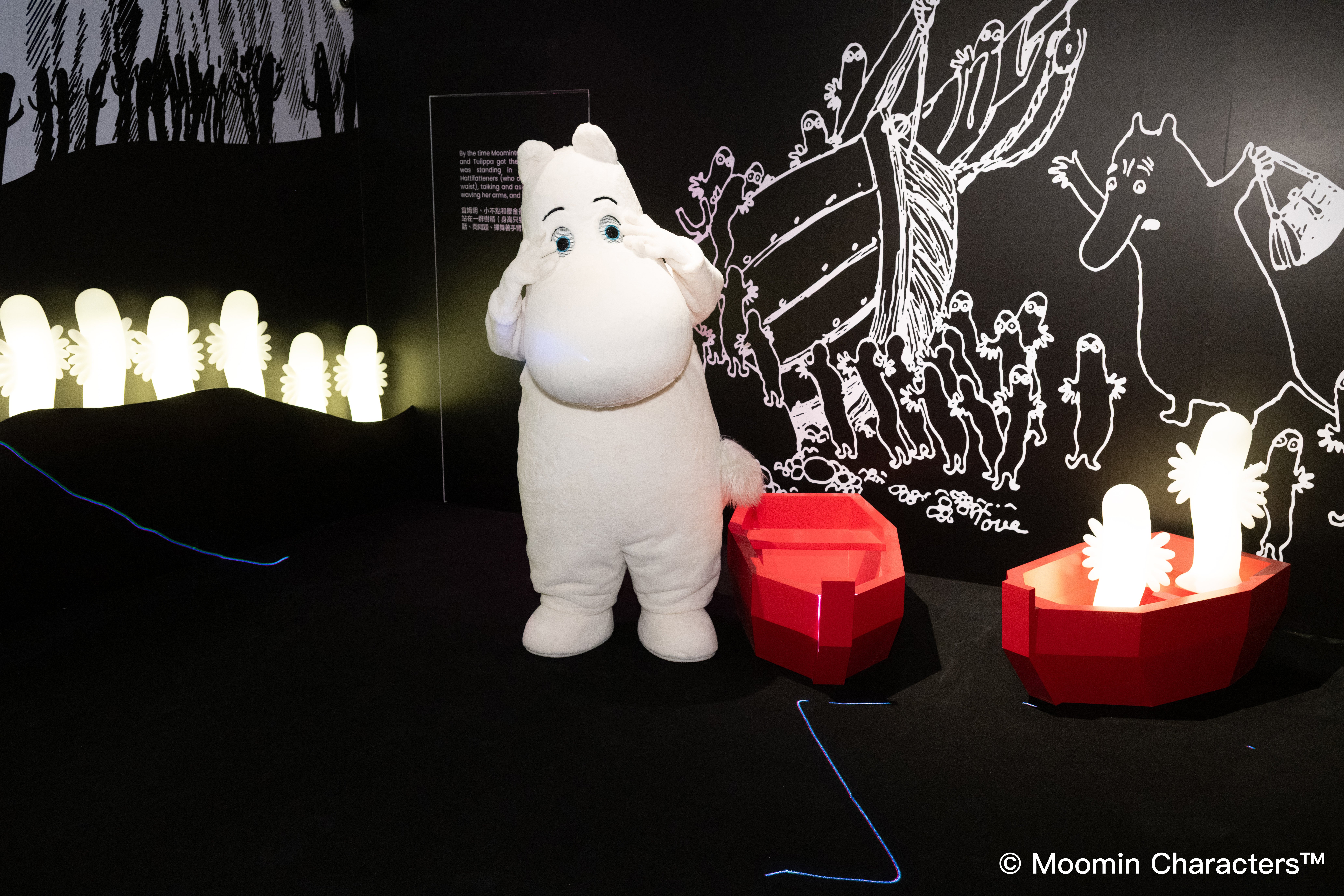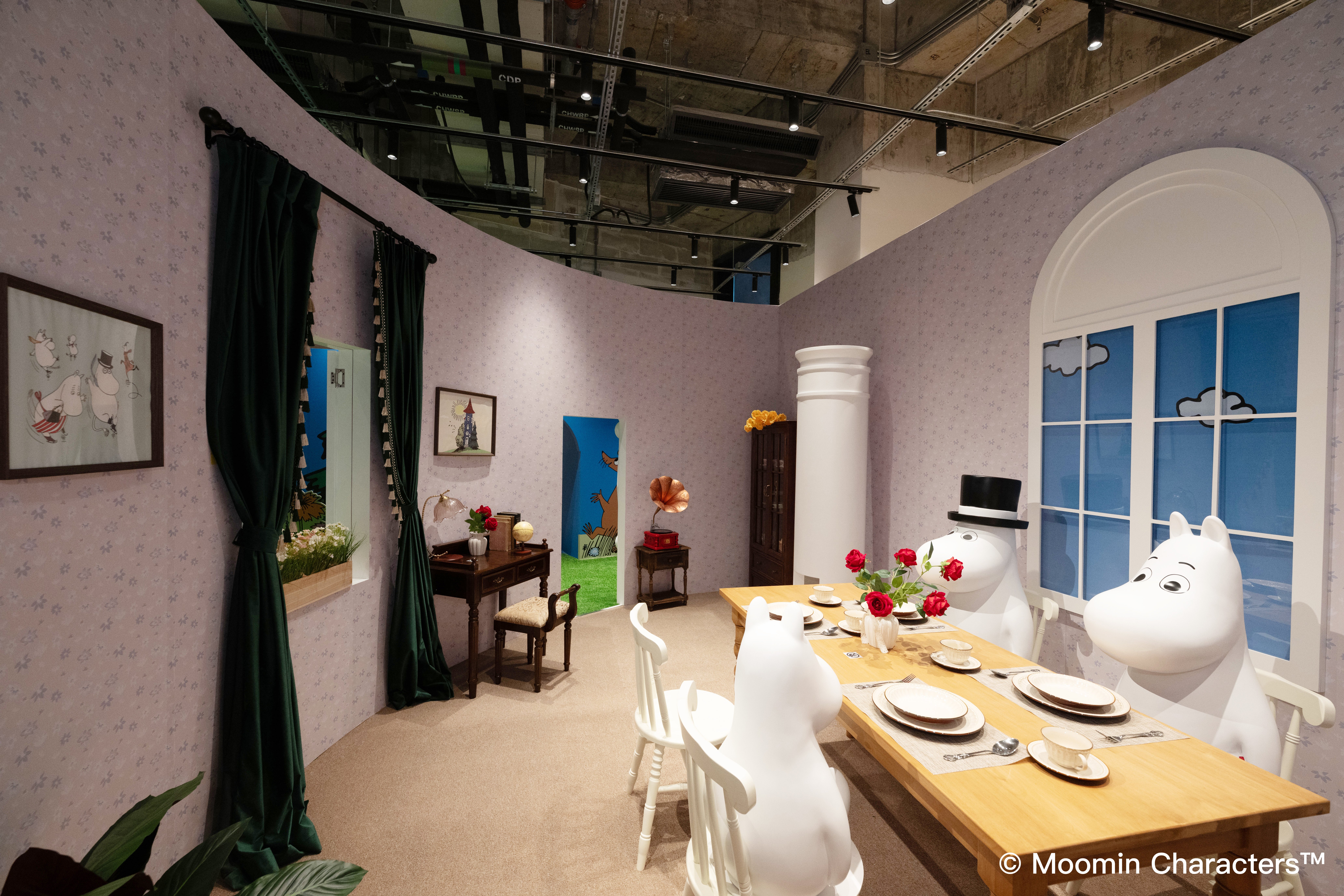 展覽重現姆明初章世界,精心打造七大經典場景,帶領觀眾從神秘的魔法森林到繽紛夢幻的老先生糖果屋,跟隨姆明一家尋找姆明爸爸之旅。芬蘭創意團隊Null Division Oy運用動態投影技術,還原標誌性姆明屋,讓粉絲進入其中與姆明一家合影。入口處的引言區以姆明家族剪影及80周年標語揭開序幕,序章區展示藝術家托芙・揚松創作背景與靈感。七大經典場景包括幽暗森林區、老先生糖果屋、樹精秘境、暴雨冒險、洪水來襲、花園派對及姆明屋,結合沉浸式互動與投影藝術,讓參觀者體驗童話魅力,感受姆明的奇幻世界。