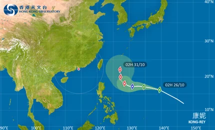 颱風康妮最新消息|天文台表示,康妮會在未來兩三日橫過菲律賓以東之西北太平洋。SundayMore整合颱風路徑、預測位置等,亦提供颱風影響下的受影響航班、旅遊保險賠償資訊。