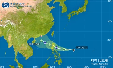 熱帶低氣壓位於北緯 144 度,東經 1335 度 (即香港之東南偏東約 2220 公里)。中心附近最高持續風速每小時 45 公里。位於菲律賓以東海域的熱帶氣旋會在未來一兩日移向呂宋一帶並逐漸增強。